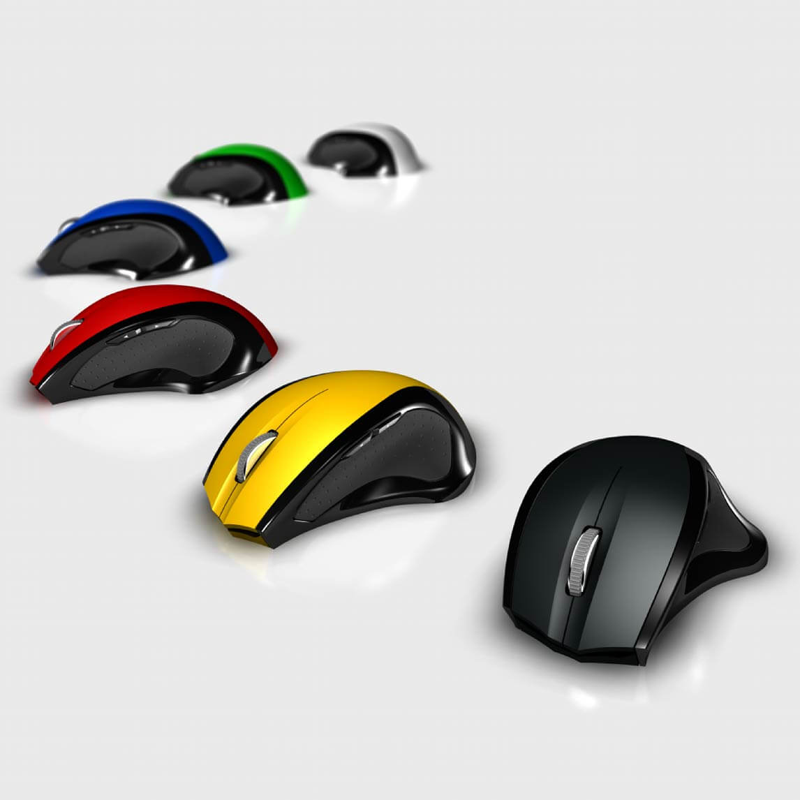利用滑鼠按鍵上蓋之換料射出 , 配合相同且沉穩之下蓋底座 , 故用同一套模具就可以打造多色彩之系列產品 . 再更換 Rubber 貼片之顏色 , 又可以再打造更多配色組合 . 這都是在同一套模具下可以達成的多樣化製造 .