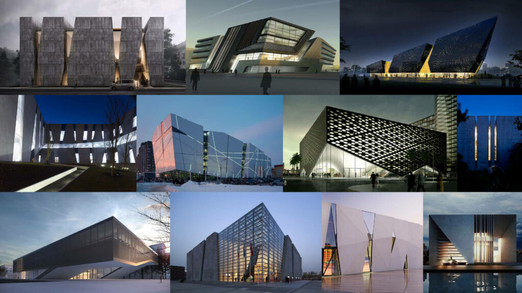 塊體透過切割可以產生形狀豐富的小塊體 , 不是脫離 , 而是維持大型的前提下 , 產生功能的不同 . 例如左上方的建築 , 透過切割 , 產生多塊的小梯形玻璃窗 , 為室內引入光線 .